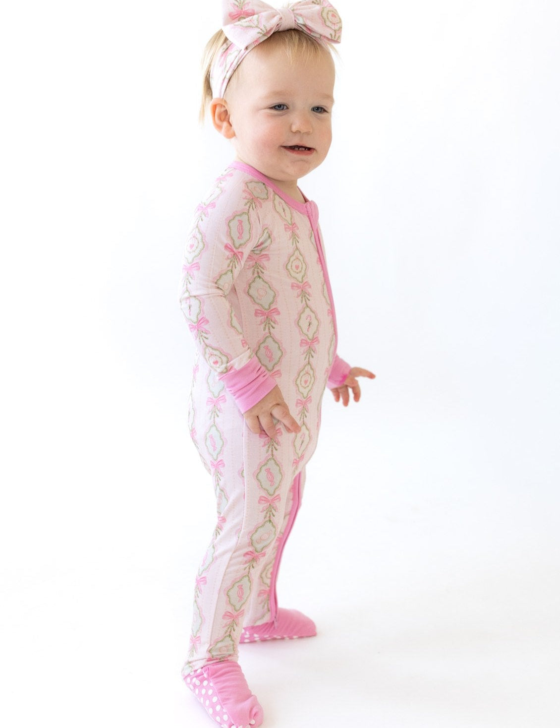 - Fold-over feet on all sizes, with sole grips on sizes 6-12 months and up for little ones on the move.